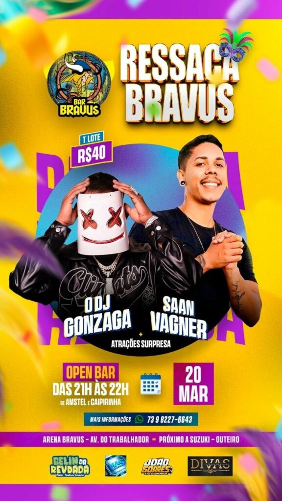 A Ressaca Bravus acontece no dia 20 de março de 2026, a partir das 21h > 21 mar – 2026 • 21:00, na Arena Bravus, em Porto Seguro. O evento promete manter a energia da festa com muita música e animação, trazendo DJ Gonzaga no comando da pista com hits para ninguém ficar parado.