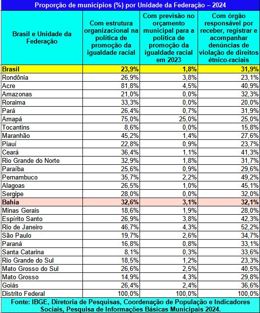 A Pesquisa de Informações Básicas Municipais de 2024, feita com todas as 5.570 prefeituras do Brasil, revelou um dado alarmante sobre a Bahia. Apenas 136 dos 417 municípios baianos possuem alguma estrutura para promoção da igualdade racial. Embora esse número represente 32,6% do total, superando a média nacional de 23,9%, ele está longe de refletir o perfil demográfico do estado.