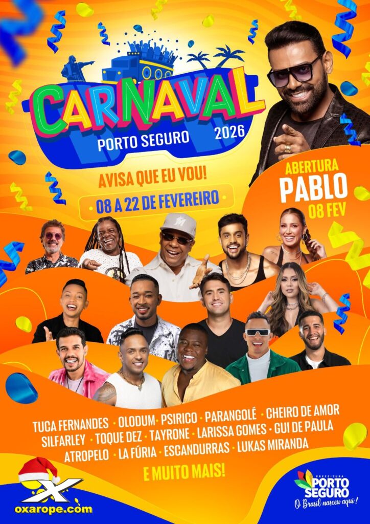 A Prefeitura de Porto Seguro lançou nesta terça-feira (23/12), a grade de atrações do Carnaval 2026, em coletiva à imprensa na sede da Secretaria de Turismo, com representatividade da Abih, prometendo uma edição histórica que vai transformar a Terra Mãe do Brasil no polo mundial da pipoca e diversão. De 8 a 22 de fevereiro, o destino mais festivo do país se prepara para receber milhares de foliões vindos de todos os cantos, embalados por grandes nomes da música baiana. “Com o tema ‘Avisa que eu vou!’, a folia chega com força total, reunindo tradição, cultura e pura energia em uma festa que promete ser o maior Carnaval de todos os tempos”, frisa o secretário de Turismo, Guto Jones.