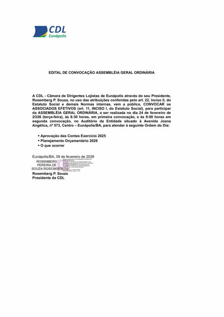 O edital é assinado pelo presidente da CDL Eunápolis, Rosemberg P. Souza, com base no artigo 22, inciso II, do Estatuto Social da entidade. A convocação é direcionada aos associados efetivos, conforme previsto no artigo 11, inciso I.