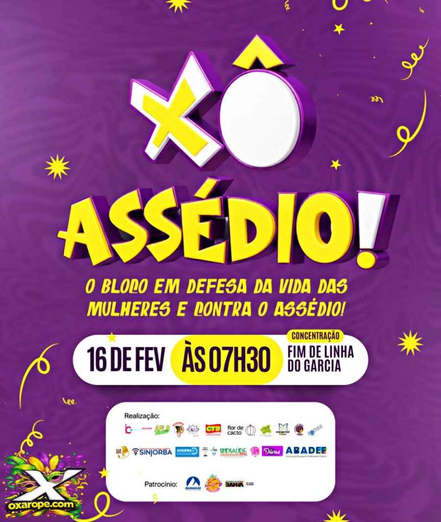 Pelo terceiro ano consecutivo, o bloco Xô Assédio! vai ocupar o Circuito Riachão, durante o tradicional desfile da Mudança do Garcia, na segunda-feira de Carnaval, levando para as ruas a pauta do combate à violência contra a mulher. A Comissão de Mulheres do Sindicato dos Jornalistas Profissionais da Bahia (Sinjorba) estará presente no ato, reforçando o compromisso da entidade com a defesa dos direitos das mulheres e o enfrentamento às desigualdades de gênero.
