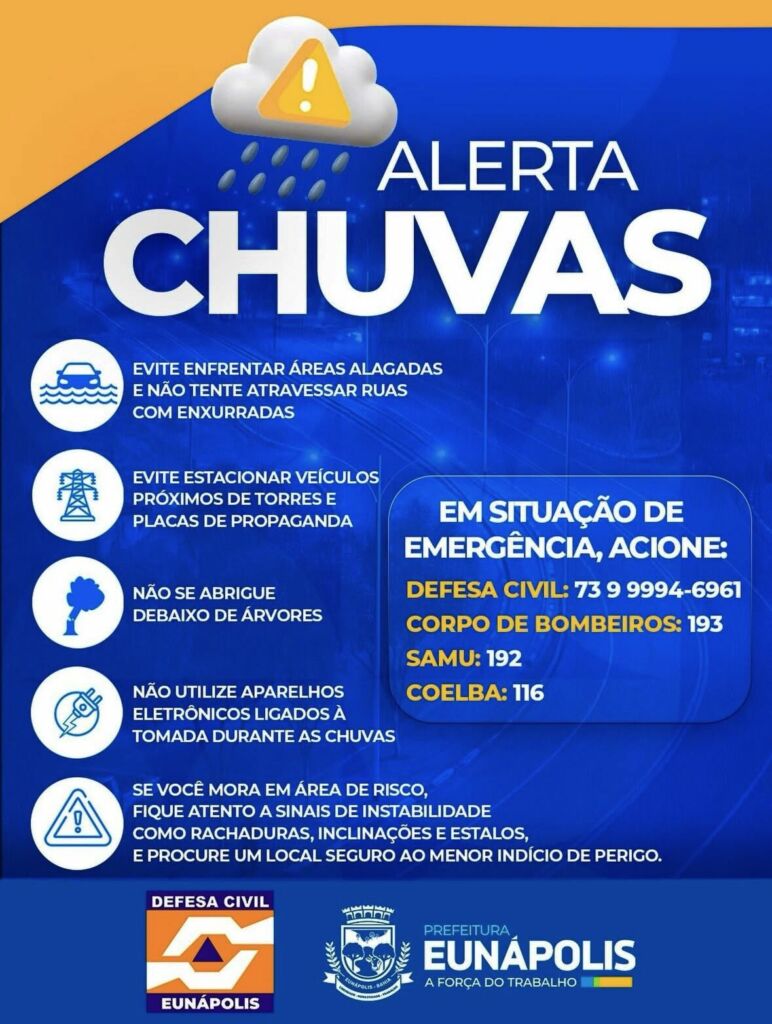 A Prefeitura de Eunápolis, por meio da Coordenadoria Municipal de Proteção e Defesa Civil, informa que há previsão chuva forte para os próximos dias, com momentos de instabilidade mais intensa no município.