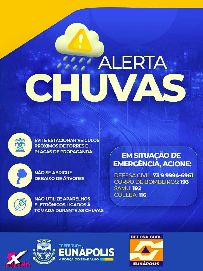 Em caso de emergência, os moradores podem acionar a Defesa Civil pelo número (73) 99994-6961, o Corpo de Bombeiros pelo 193, o SAMU pelo 192 e a Coelba pelo 116. A Prefeitura de Eunápolis segue em alerta e reforça seu compromisso com a segurança e o bem-estar de todos os eunapolitanos.