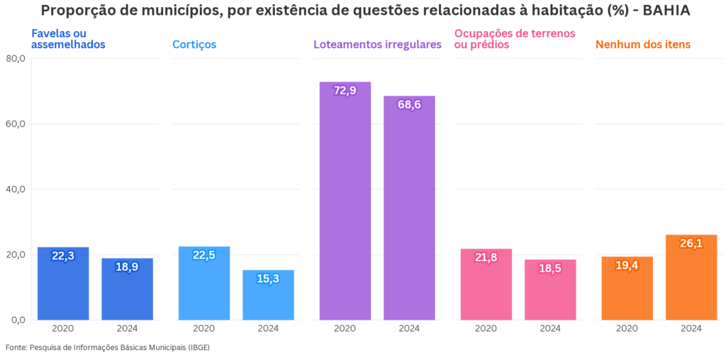 A redução no número de municípios com habitações precárias indica avanço. Mas o volume de cidades baianas com loteamentos irregulares, cortiços ou ocupações ainda é alto. Em 2024, 286 cidades tinham loteamentos ilegais, 64 registravam cortiços e 77 possuíam ocupações de prédios ou terrenos por movimentos de moradia.