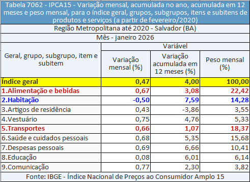 O IPCA-15 é considerado uma prévia da inflação oficial e reflete os preços coletados entre os dias 13 de dezembro de 2025 e 14 de janeiro de 2026. Na RMS a taxa de 0,47% representa uma leve aceleração em relação ao mês anterior (0,41%) superando também a média nacional de 0,20%.