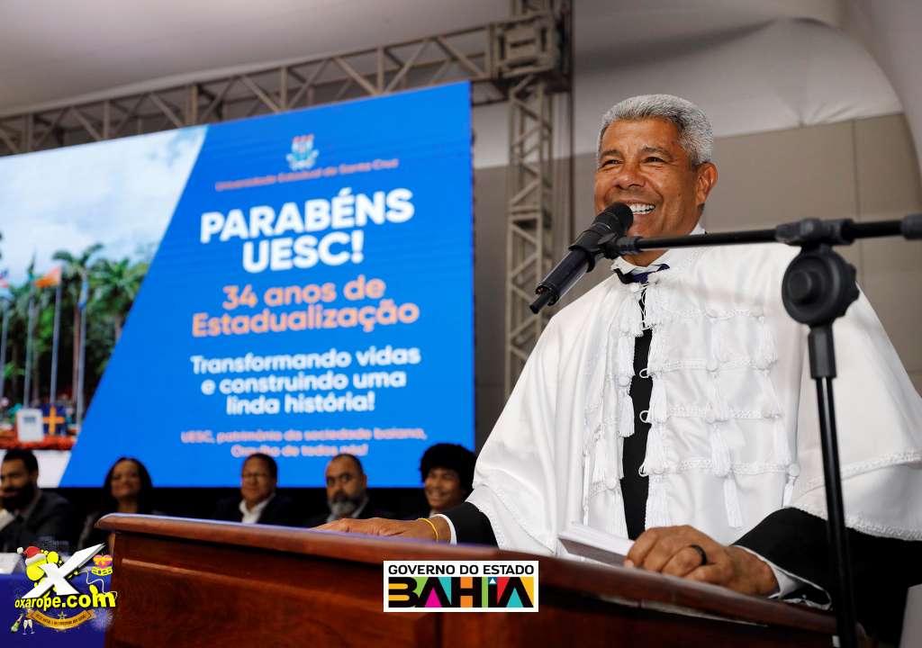 Nesta sexta-feira (5), a Universidade Estadual de Santa Cruz (Uesc) comemorou 34 anos de estadualização com um marco histórico: a outorga do título de Doutor Honoris Causa ao governador Jerônimo Rodrigues, que se torna o primeiro governador, em exercício da função, a receber a honraria na história da instituição. A sessão solene especial realizada pelo Conselho Universitário (Consu) celebrou a trajetória da universidade e reconheceu personalidades que contribuem de forma significativa para o desenvolvimento da Bahia e do país.