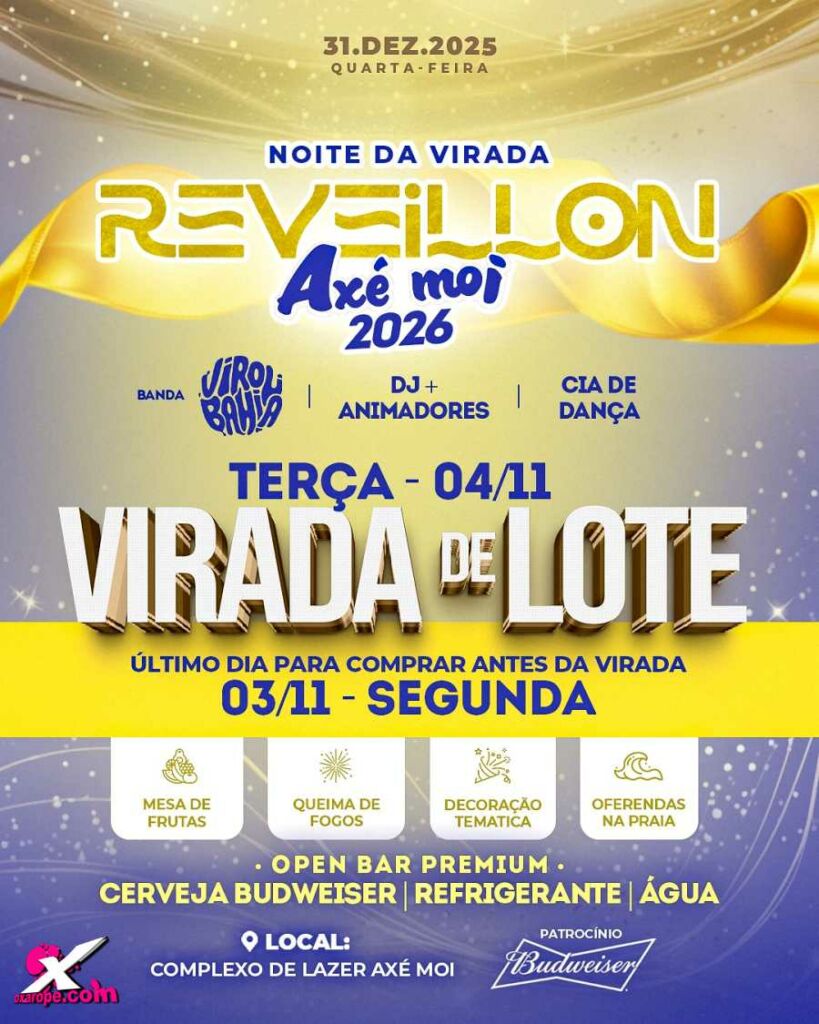 A festa que vai marcar a chegada de 2026 está imperdível: no dia 31 de dezembro, às 22h, o Axé Moi Praia te espera para uma virada pé na areia, com muita animação e energia positiva. Prepare-se para curtir a banda Virou Bahia ao vivo e brindar o novo ano com Budweiser gelada, além de refrigerante e água à vontade no open bar.