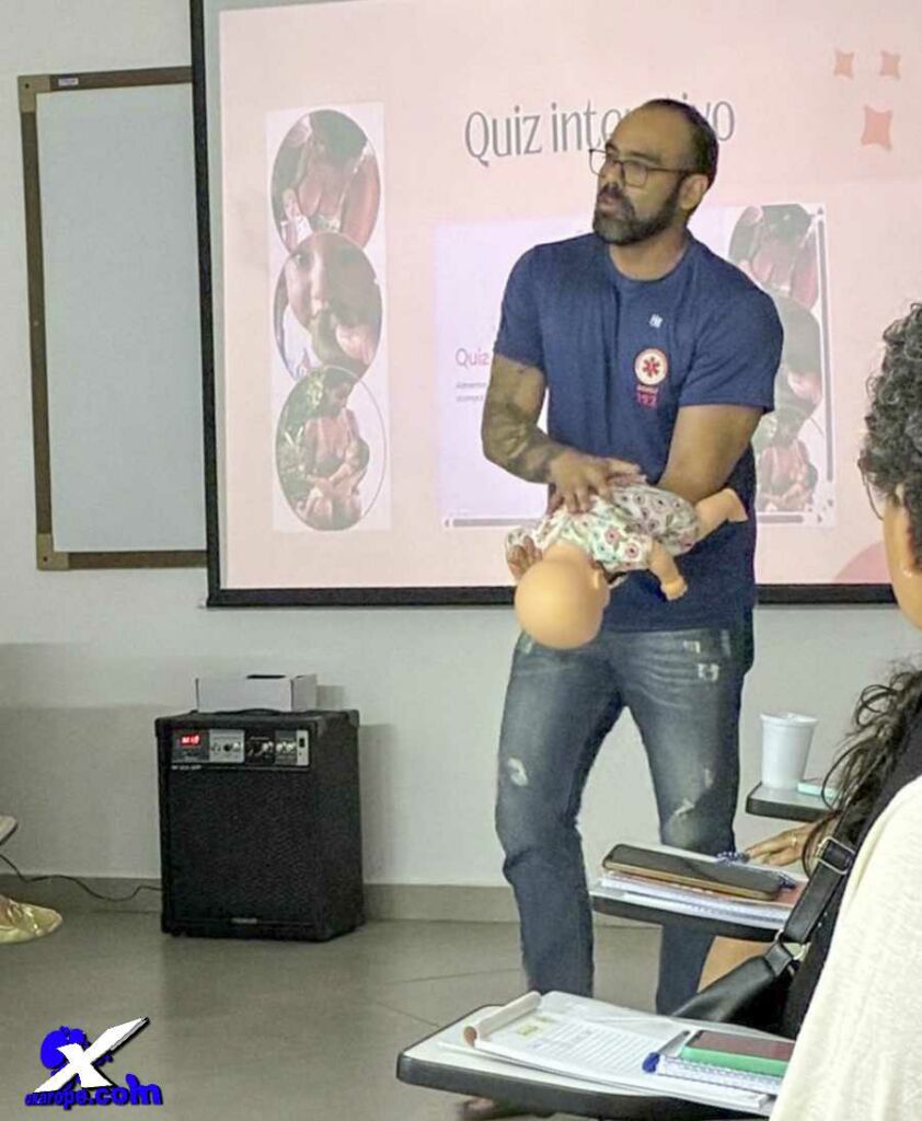 A programação contou ainda com a participação do SAMU, representado pelos profissionais Lucas Marinho, enfermeiro, e Manoel Messias Filho, socorrista, que demonstraram na prática as manobras de desengasgo e suas atualizações recentes. A Saúde Bucal também teve destaque, com a participação da cirurgiã-dentista Lourdes Maria Pimenta, que abordou a relação entre alimentação saudável e prevenção de cáries dentárias na infância.